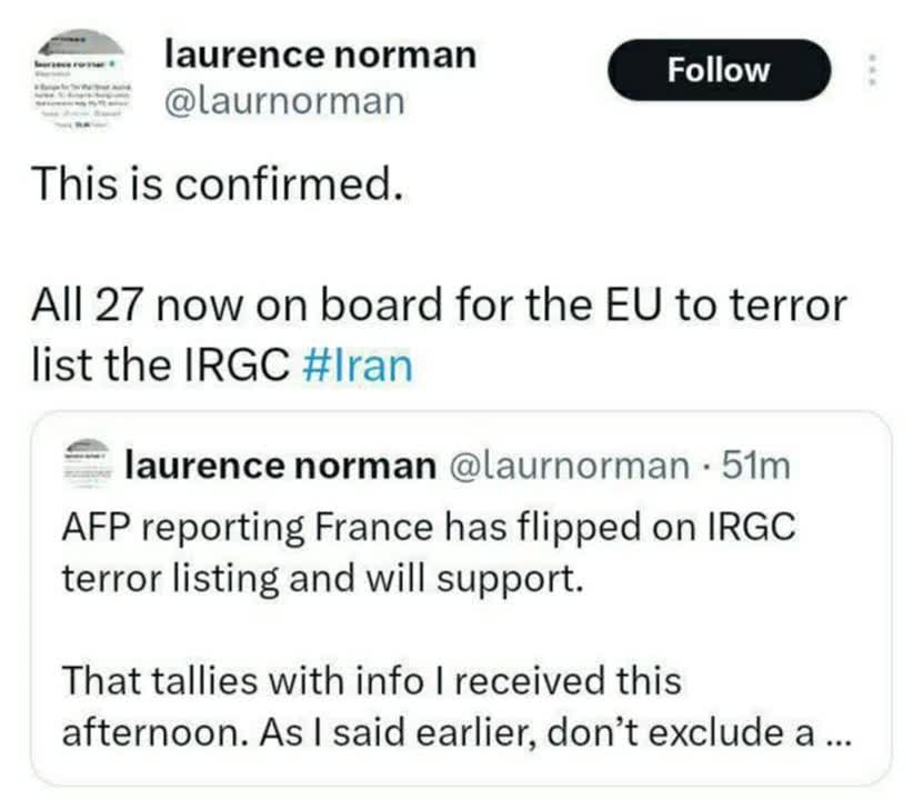 ادعای لارنس نورمن، خبرنگار وال استریت ژورنال: 27 کشور اتحادیه اروپا قصد دارند سپاه پاسداران را تروریستی اعلام کنند